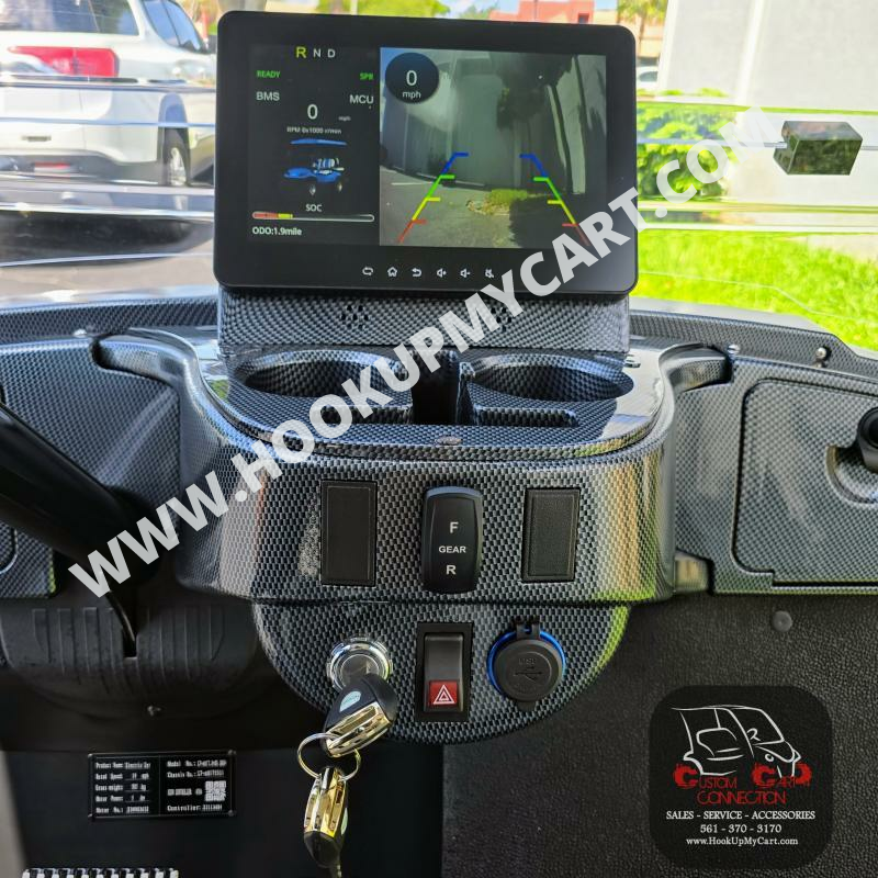 Dash Components:** Forward/Neutral/Reverse Switch, USB and 12V Plugs, Cubby Storage, Multiple Cup Holders, Key Switch, Instrumentation Cluster