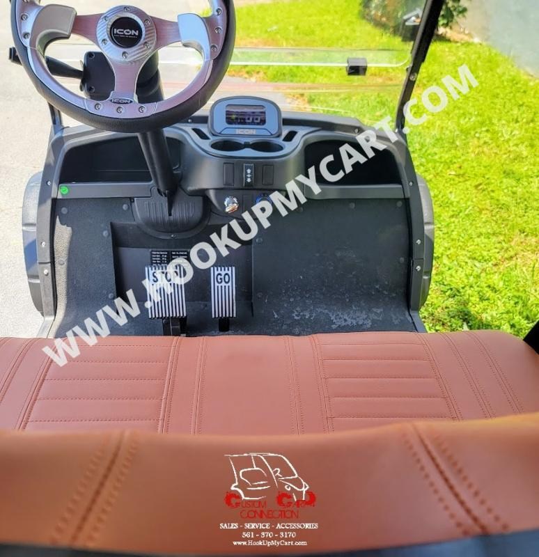 The ICON i40L Golf Cart comes fully loaded. You can take comfort in the fact that when you purchase an ICON Electric Vehicle you are getting a top quality product. ICON EV’s are built using 450 amp controllers and 48 Volt AC 5kw motors. Standard with all ICON EV models are onboard charger LED head lights, brake lights, daytime running lights, night time running lights & brights, turn signals, horn, tires, seat belts, side view mirrors, digital gauges and disc brakes all around.