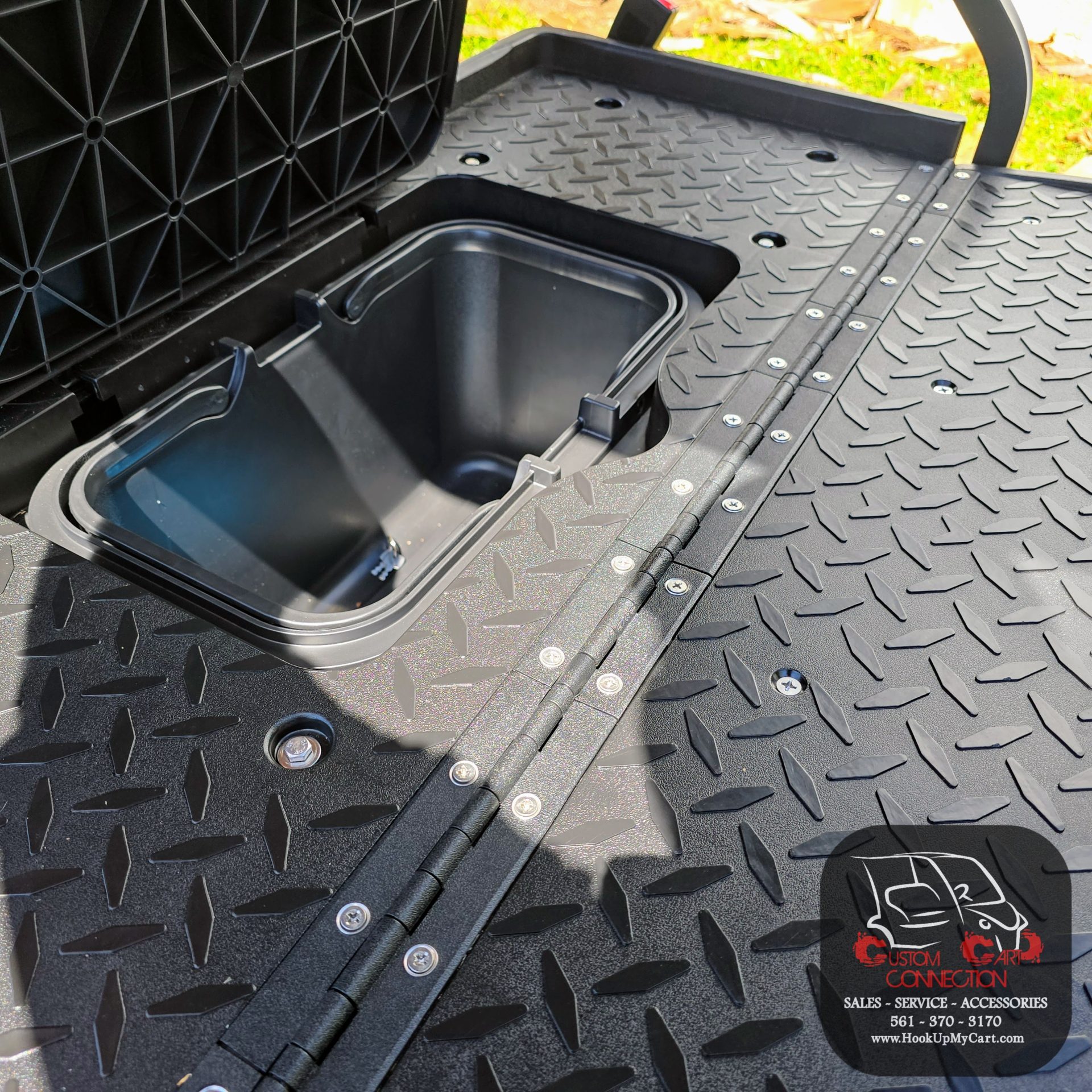 - Seats: Thick Plush Seats with Custom Stitched Paneling, Marine Grade Vinyl, Solid Black or Brown, Color Matched with Black Accents. Foldable Rear Seat Perfect for Hauling. Built in Cooler Beneath Rear Seat.