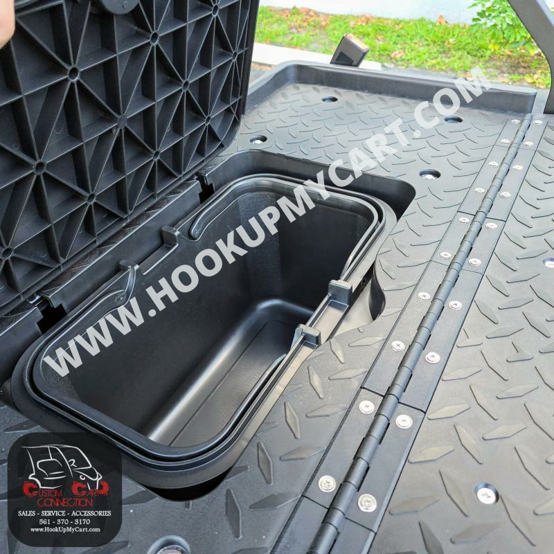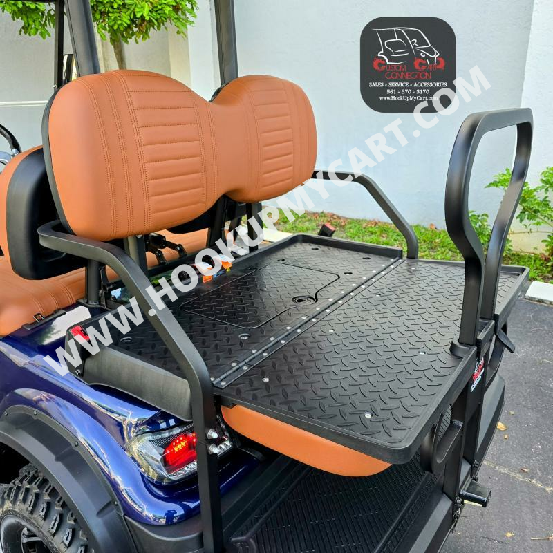 • Seats: Thick Plush Seats with Custom Stitched Paneling, Marine Grade Vinyl, Solid Black or Brown, Color Matched with Black Accents. Foldable Rear Seat Perfect for Hauling. Built in Cooler Beneath Rear Seat.