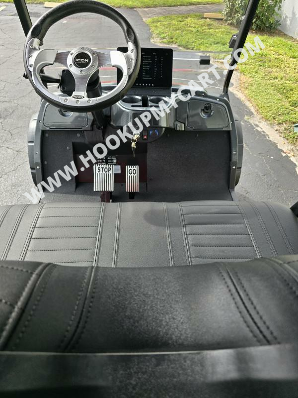 The ICON i40L Golf Cart comes fully loaded. You can take comfort in the fact that when you purchase an ICON Electric Vehicle you are getting a top quality product. ICON EV’s are built using 450 amp controllers and 48 Volt AC 5kw motors. Standard with all ICON EV models are onboard charger LED head lights, brake lights, daytime running lights, night time running lights & brights, turn signals, horn, tires, seat belts, side view mirrors, digital gauges and disc brakes all around.