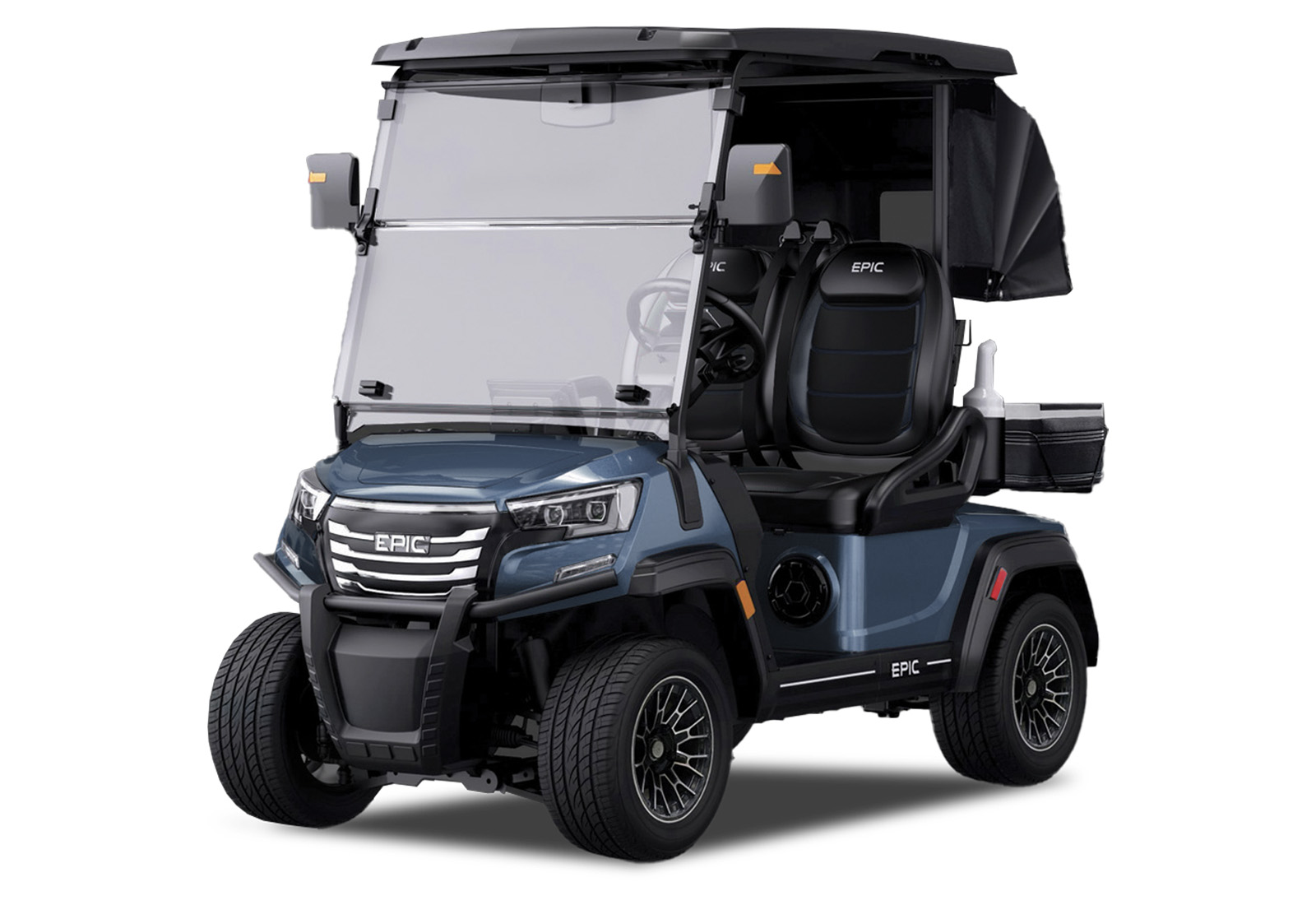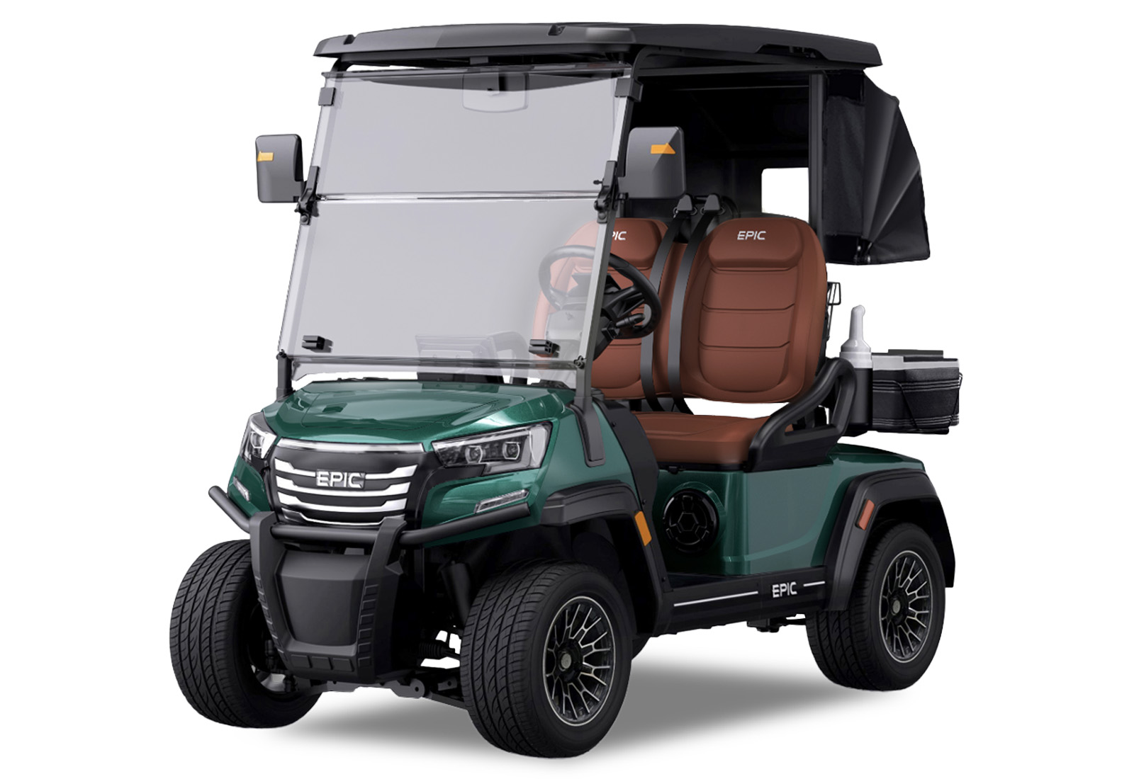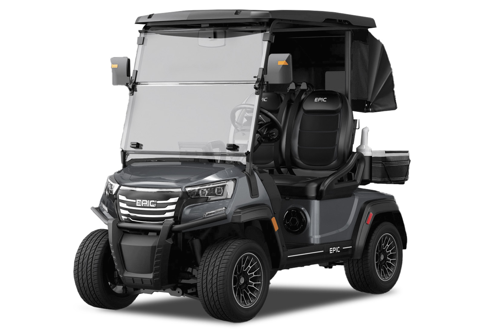 The brand new Epic E20FX golf cart model is creating quite the buzz industry-wide! Furnished with every desirable feature, this two-seater Epic golf cart comes in seven stylish metallic colors. Premium 12” turf friendly tires provide a super smooth and enjoyable ride on and off the golf course. With a top of the line built-in marine-grade sound system, stunning accent lighting, and a rear golf kit with two coolers, two sand bottles, and two golf bag holders, and golf bag rain cover, this Epic E20FX golf cart will make you the envy of every golfer on and off the course